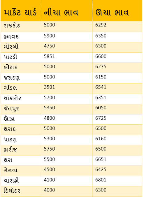 આજે બોટાદ માર્કેટ યાર્ડ માં જીરું ના ભાવ 5000 થી 6275 બોલાયા હતા , આજે થરા માર્કેટ યાર્ડ માં જીરું ના ભાવ 5500 થી 6651 બોલાયા હતા ,આ જે રાધનપુર માર્કેટ યાર્ડ માં જીરું ના ભાવ 4500 થી 6400 બોલાયા હતા , આજે કાલાવડ માર્કેટ યાર્ડ માં જીરું ના ભાવ 4800 થી 6515 બોલાયા હતા